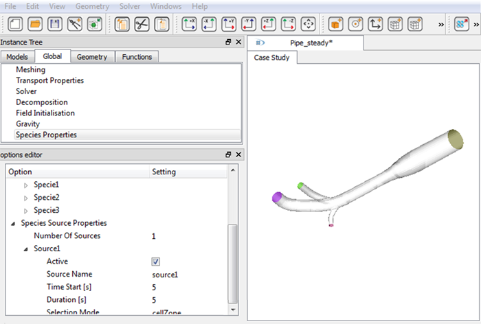 L’interface utilisateur graphique iconCFD permet la configuration complète des casspeceTransportFoam et flottantBoussinesqSpeciePimpleFoam, en utilisant la condition limite de recirculation, les sources d’espèces volumétriques et les propriétés de transport des espèces.